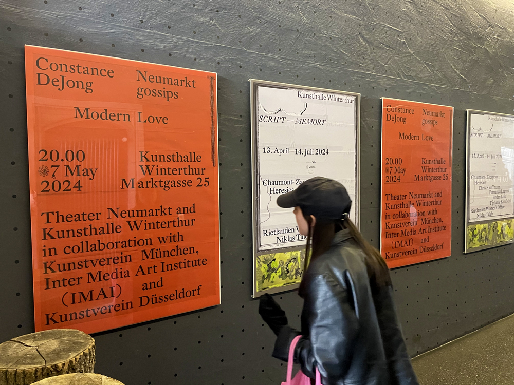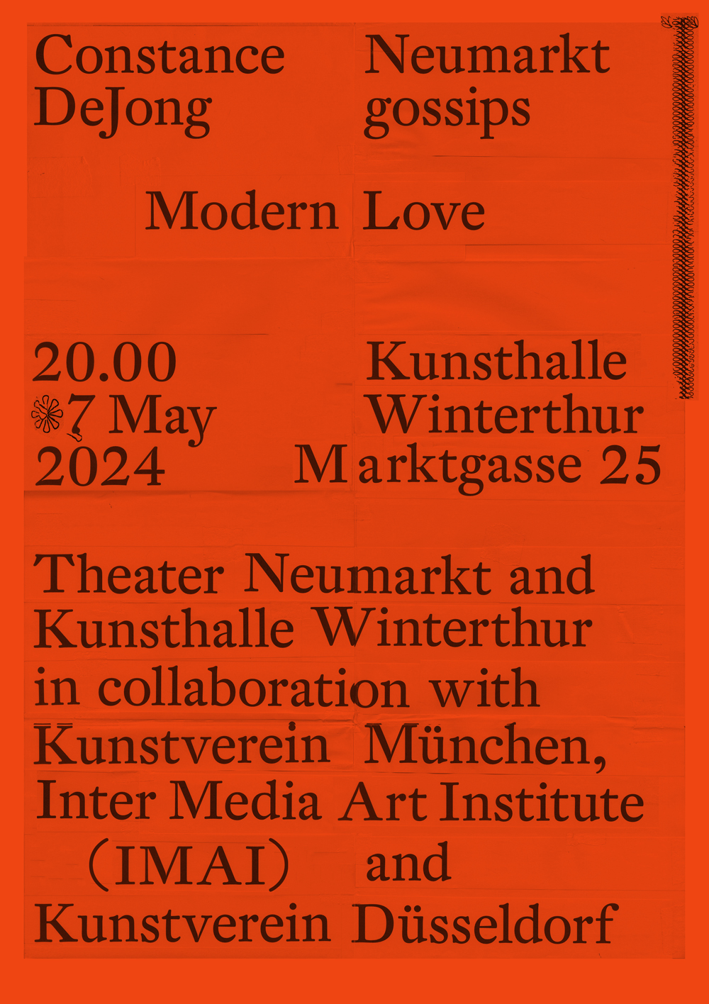 Poster for the event Constance DeJong, Modern Love, organised by Theater Neumarkt and Kunsthalle Winterthur in cooperation with Kunstverein Munich, IMAI – Inter Media Art Institute, and Kunstverein Düsseldorf.