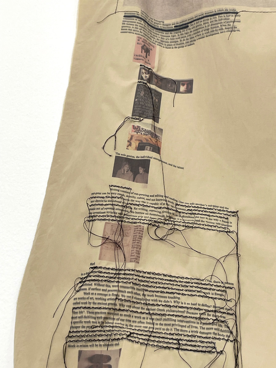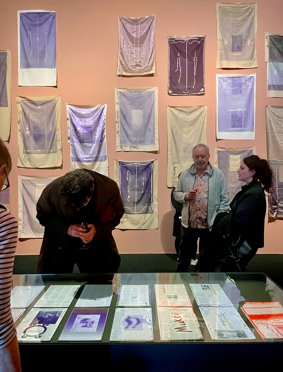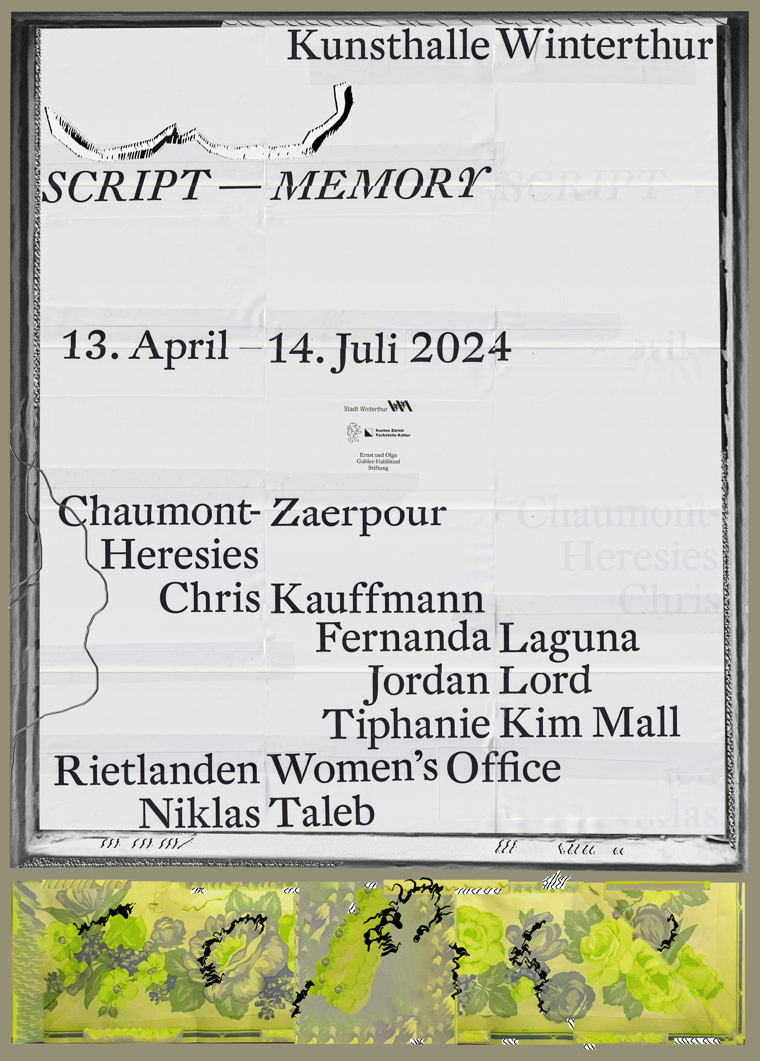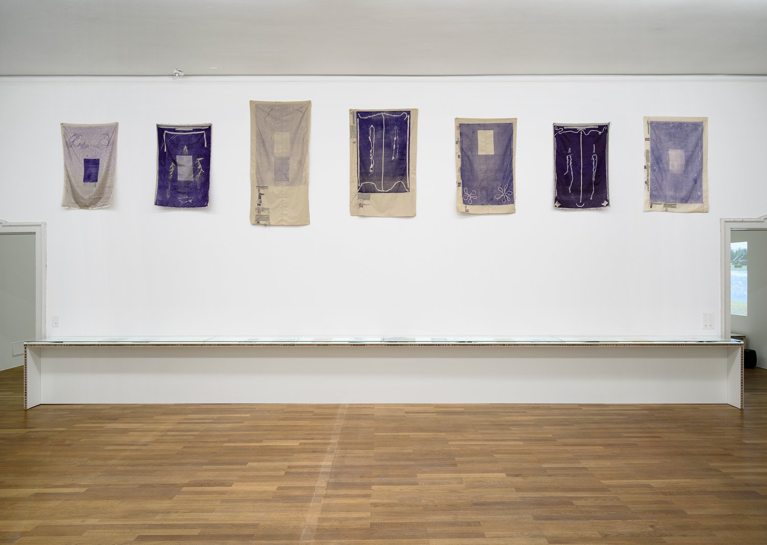 A series of seven embroidered textile monotype prints and MsHeresies 1–5, shown as part of the group exhibition SCRIPT—MEMORY at Kunsthalle Winterthur, Switzerland. Curated by Geraldine Tedder, and other works by Chaumont-Zaerpour, Heresies, Chris Kauffmann, Fernanda Laguna, Jordan Lord, Tiphanie Kim Mall, and Niklas Taleb. Photo credit overview: Cedric Mussano.