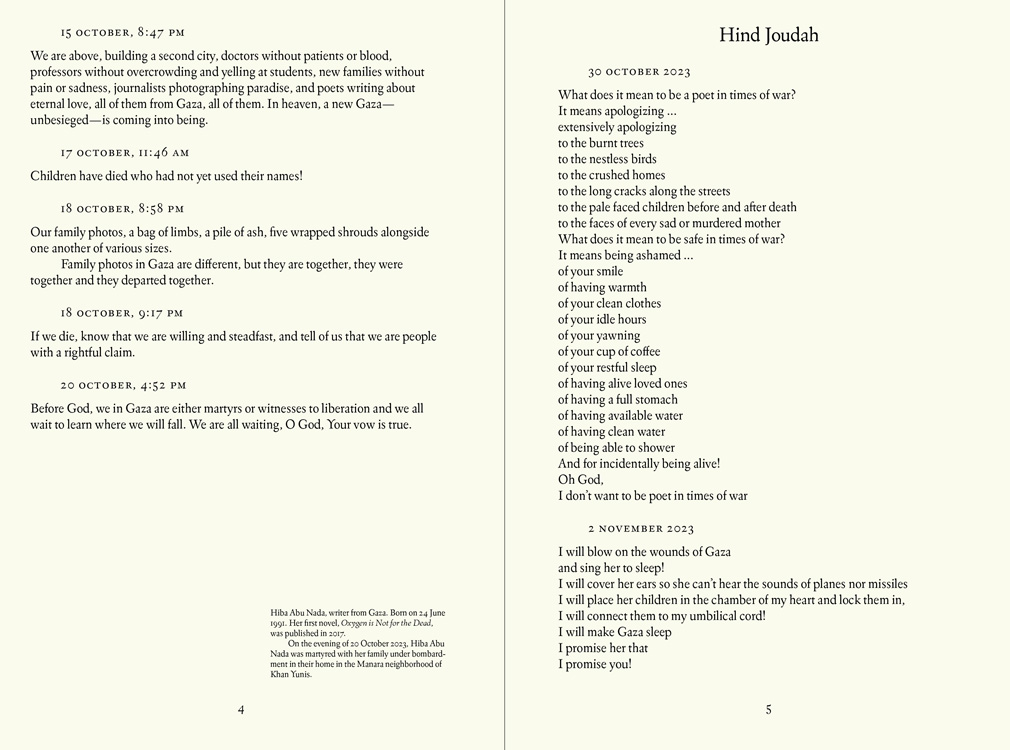 Texts sourced from Passages Through Genocide, which collects, translates, and publishes texts from Palestinian writers confronting the genocide in Gaza.