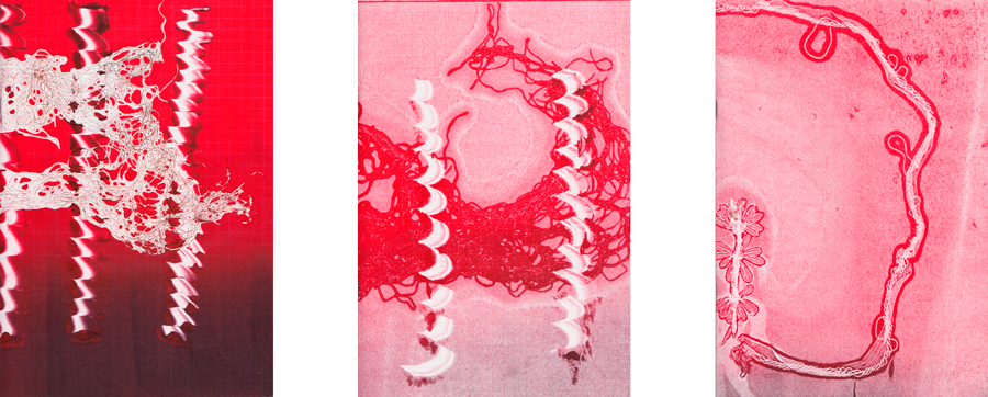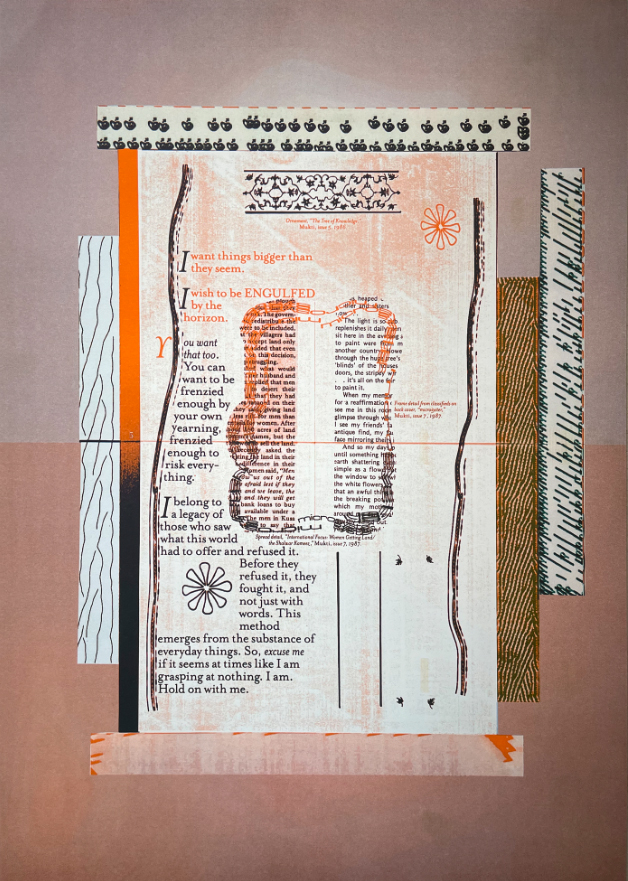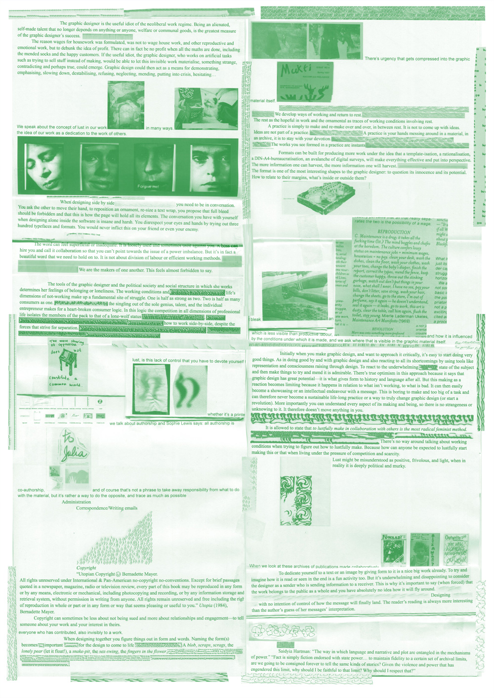 The monotype prints, with sublimated writing in their margins, are the latest publishing of an ongoing book or manifesto about collaborative graphic design. About design methods, how they refer to those of past feminist collectives, the practice of ornamentation, and the messy history of graphic design.