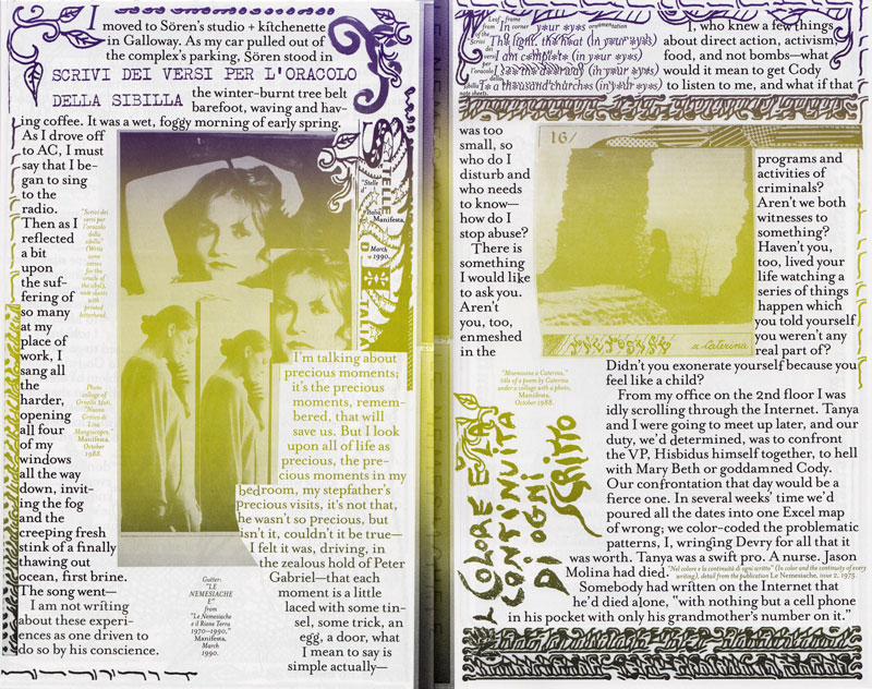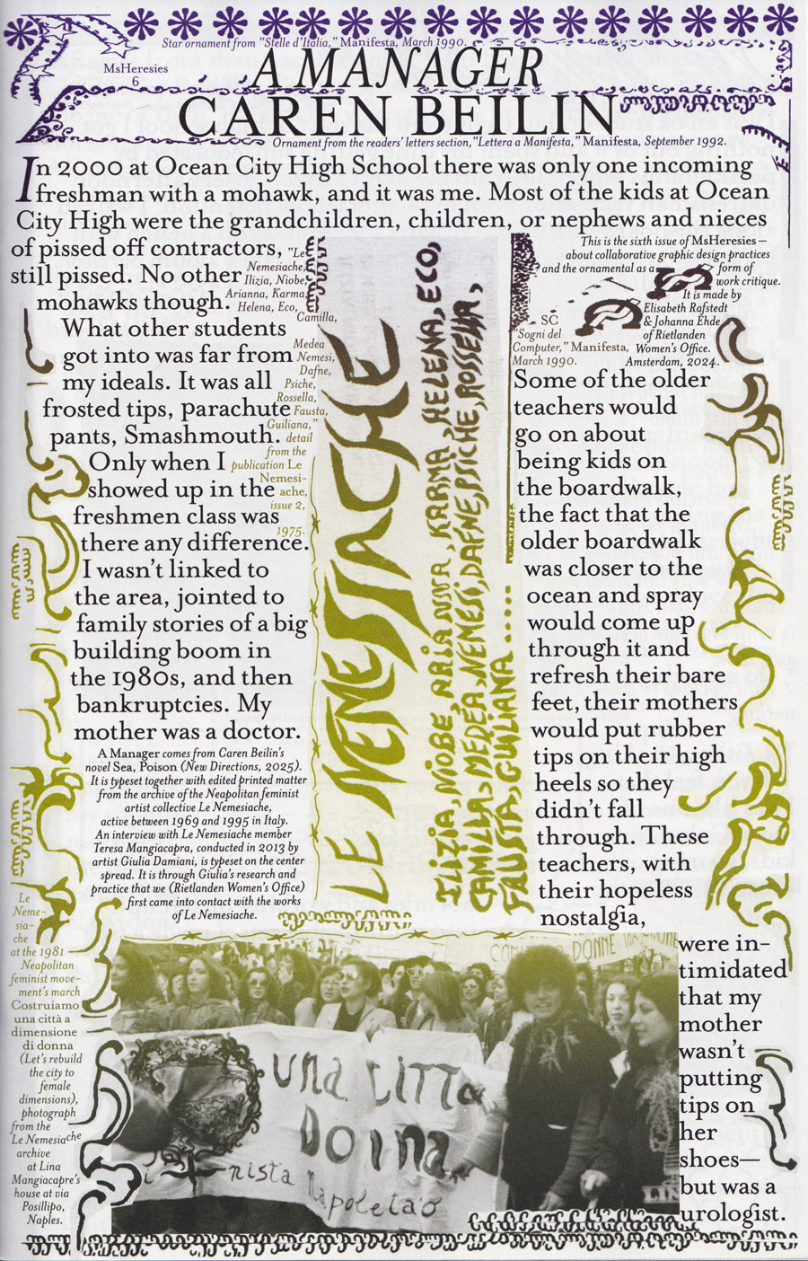 MsHeresies 6 publishes an edited chapter from Caren Beilin’s forthcoming novel Sea, Poison (New Directions, 2025). It is typeset together with reworked material from the archive of the Neapolitan feminist artist collective Le Nemesiache, active between 1969 and 1995.