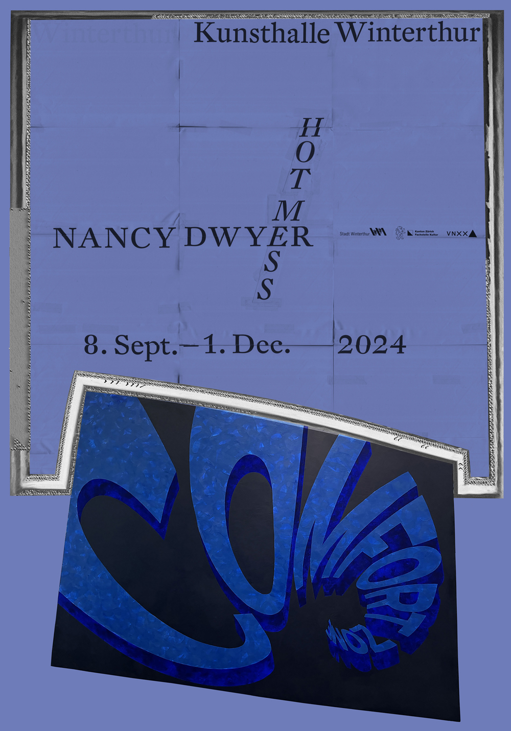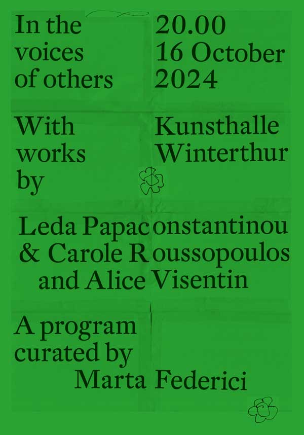 Poster for Nancy Dwyer’s exhibition Hot Mess and the programme In the voices of others curated by Marta Federici with works by Leda Papaconstantinou & Carole Roussopoulos and Alice Visentine at Kunsthalle Winterthur.
