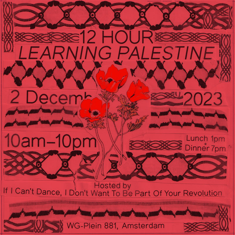 Digital leaflet for the 12 hour event for Palestine by Ooster mums, hosted by If I Can’t Dance, I Don’t Want to be Part of Your Revolution, Amsterdam.