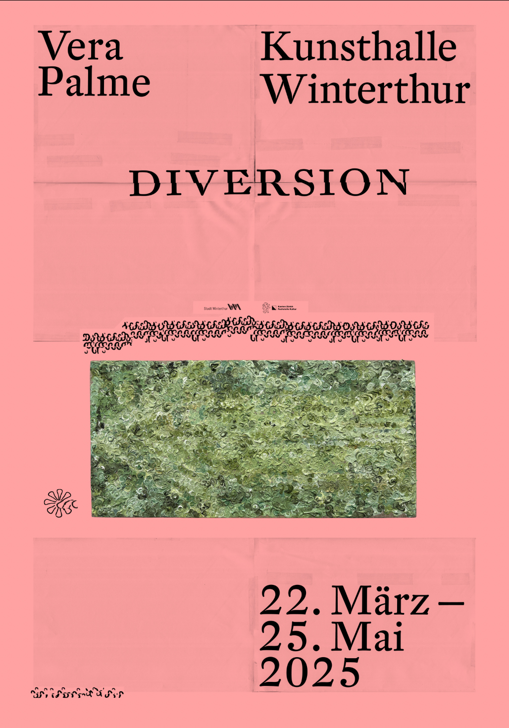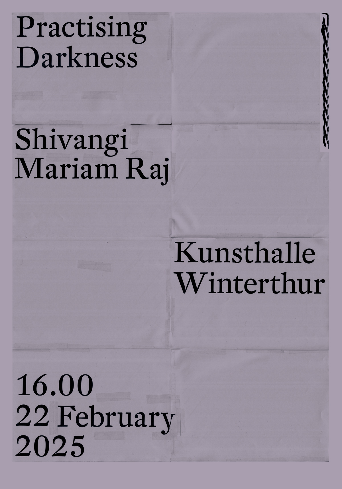 Poster for Vera Palme’s exhibition Diversion and the event Practising Darkness by Shivangi Mariam Raj at Kunsthalle Winterthur.